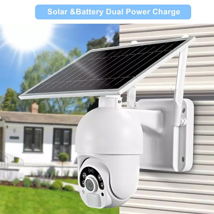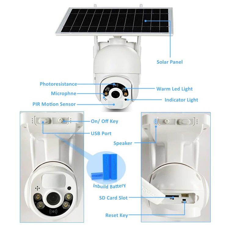 * FHD 1080P Battery/Solar Powered Solar WiFi Camera * H. 264 video format, low bit rate, saving storage * Wide-angle HD lens, high definition quality picture * Smart IR filter, day & night mode automatic switching * 2pcs Array + 2pcs warm LEDs, color night vision up to 25M * Built-in speaker and audio pickup, two-way audio talkback * Support multi-users remote access on smartphone * With PIR sensor, human induction triggered alert * Motion detection, real-time APP pusher notification * Storage by Micro SD card, supported up to 128GB * Encrypted cloud storage, more secure * 2.4GHz wireless WiFi for WAN connection * Power: Built-in rechargeable battery, 14400mAh. * Solar panel battery for charging camera * Low power consumption, 4-6 months standby time * Plug and play, no cables, no external power adapter. * IP66 waterproof, outdoor/indoor use