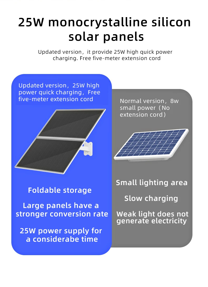 * Provide 25W solar panel, when the security camera is connected to the 25W solar panel, it has fast power charging