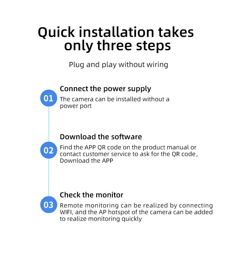 1. Wifi camera only work with 2.4Ghz wifi network, work with 4G sim card, mobile app Tuya smart life;