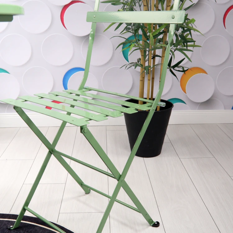 The table and chair are all metal, no plastic material is used, they are made of wrought iron metal. Metal sheet metal plate is used in the seat and back. Sheet metal plates are centered to the main body and are manufactured for commercial use. They are painted with powder paint in the oven at high temperature and can be used outdoors, even partially. Thanks to its minimal structure and foldable feature, it is an indispensable product for gardens, balconies and cafeterias. The top of the table is round, but it can also be produced as a square.