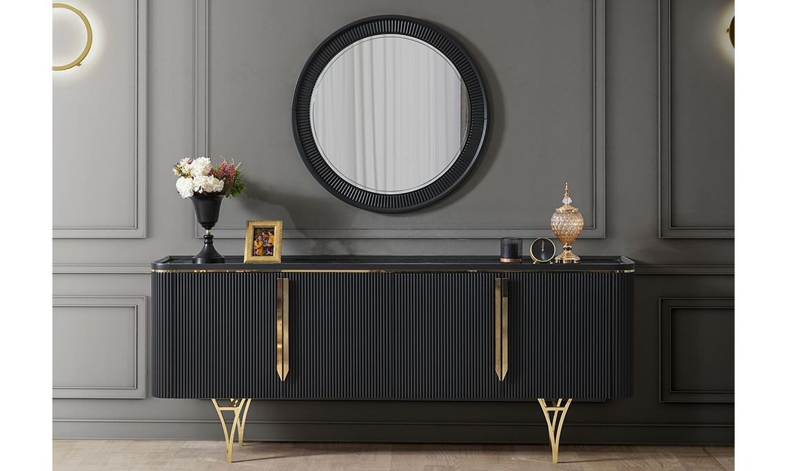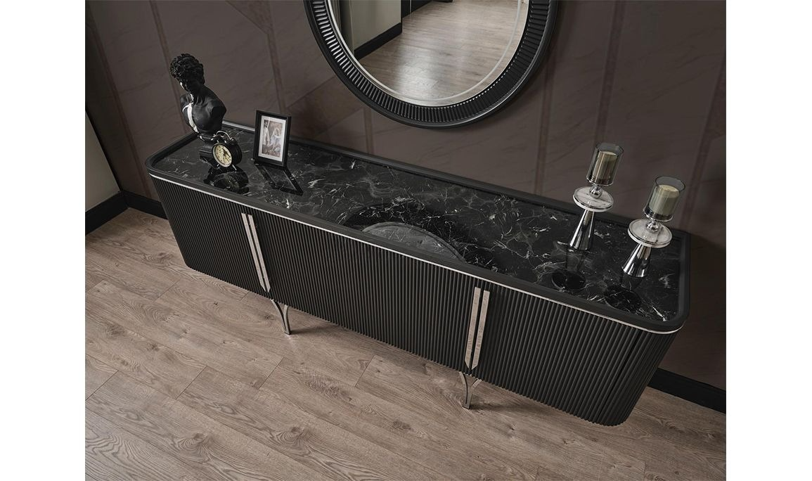 The top plate is produced by printing with a marble look. It is produced with lacquer paint on MDF material. It is decorated with CNC patterns. The legs are metal material. |
