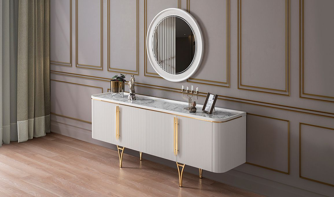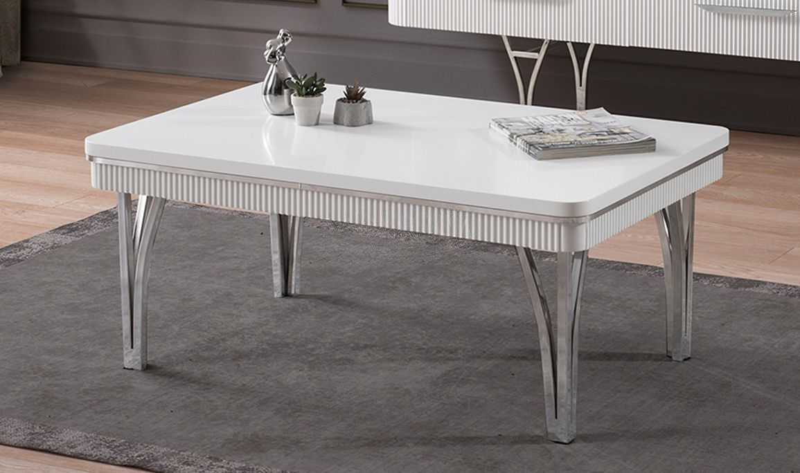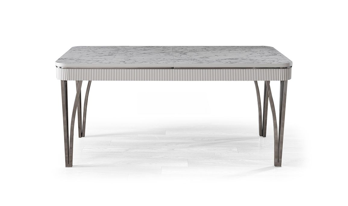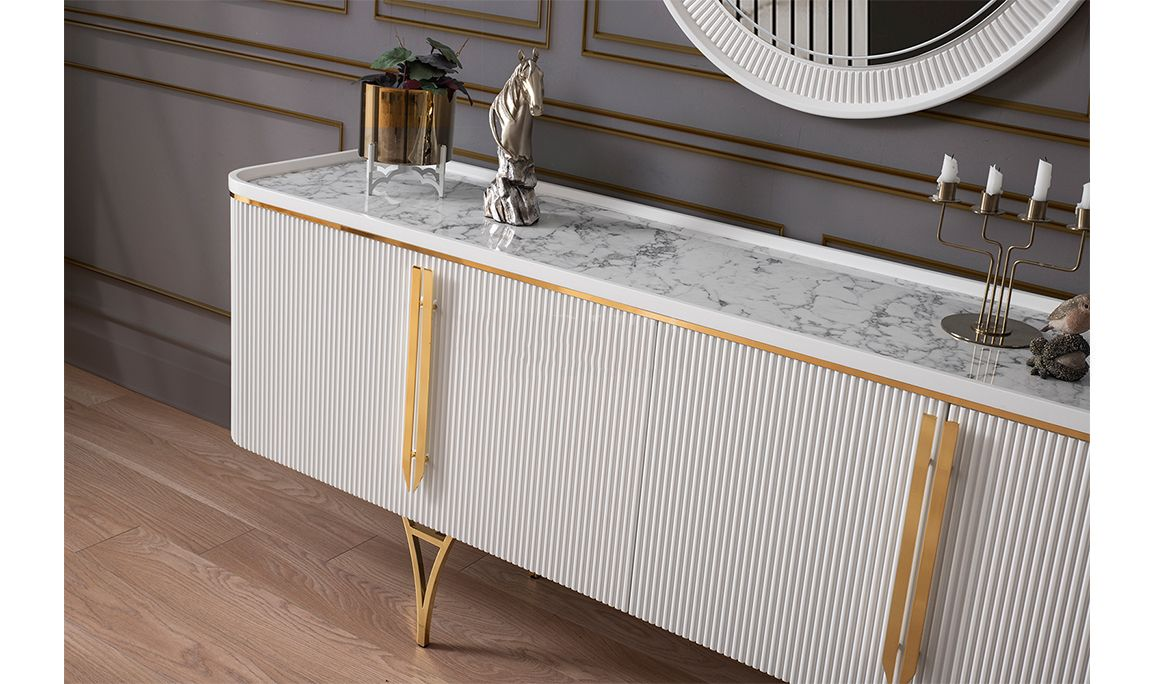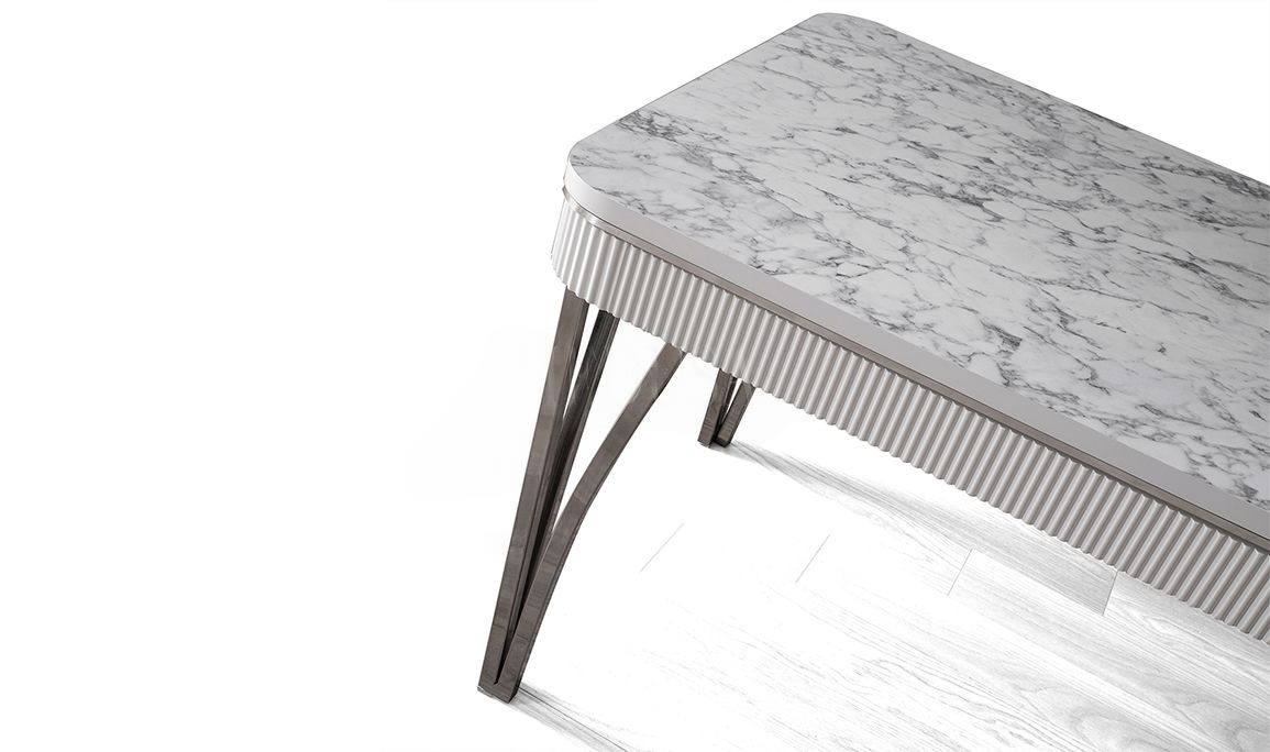 The top plate is produced by printing with a marble look. It is produced with lacquer paint on MDF material. It is decorated with CNC patterns. The legs are made of metal material. |
