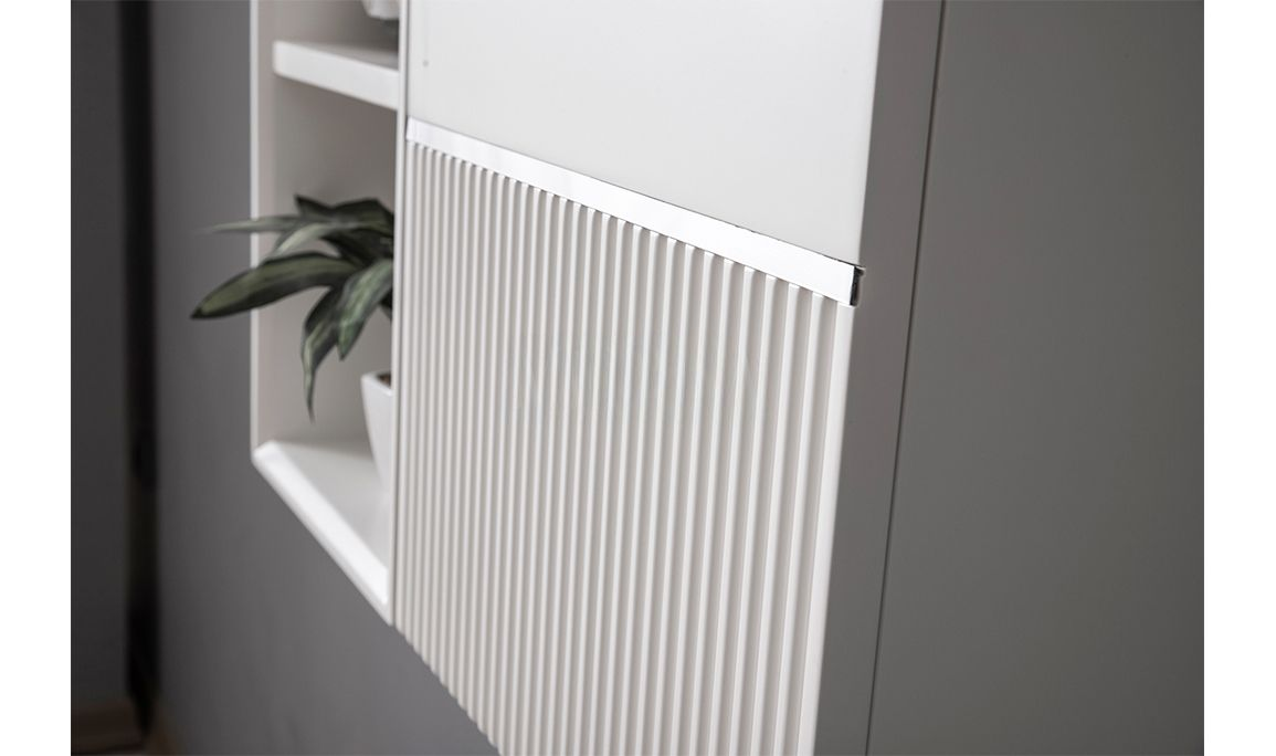 TV Unit The top plate is produced by printing with a marble look. It is produced with lacquer paint on MDF material. It is decorated with CNC patterns. The legs are metal material.