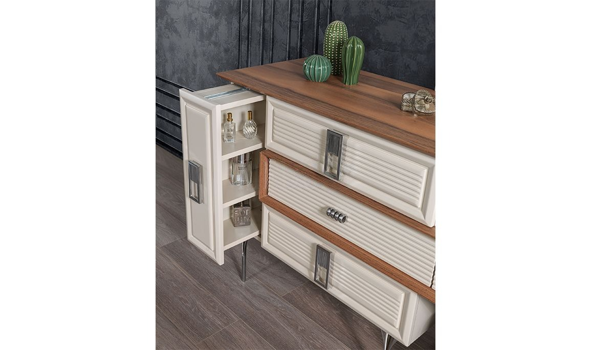 | Dresser Material | The body is manufactured with Particleboard. The front faces are made of lacquer paint on MDF material. It is decorated with CNC patterns. The legs are made of metal material. |