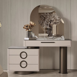 Dresser Material Made of lacquered MDF material. Top plate is made of glass. Decorated with CNC patterns. Feet are made of metal. Slowing tandem rails are used in drawers.