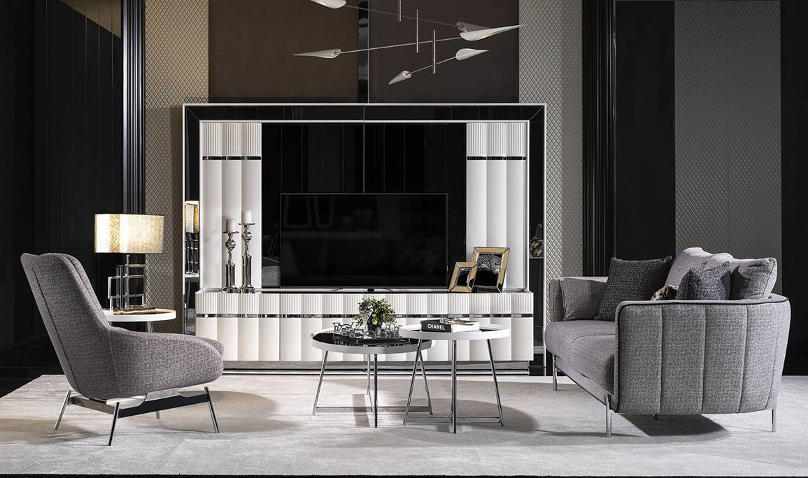 | TV Unit | Made of lacquered MDF material. Top plate is made of glass. Decorated with CNC patterns. |