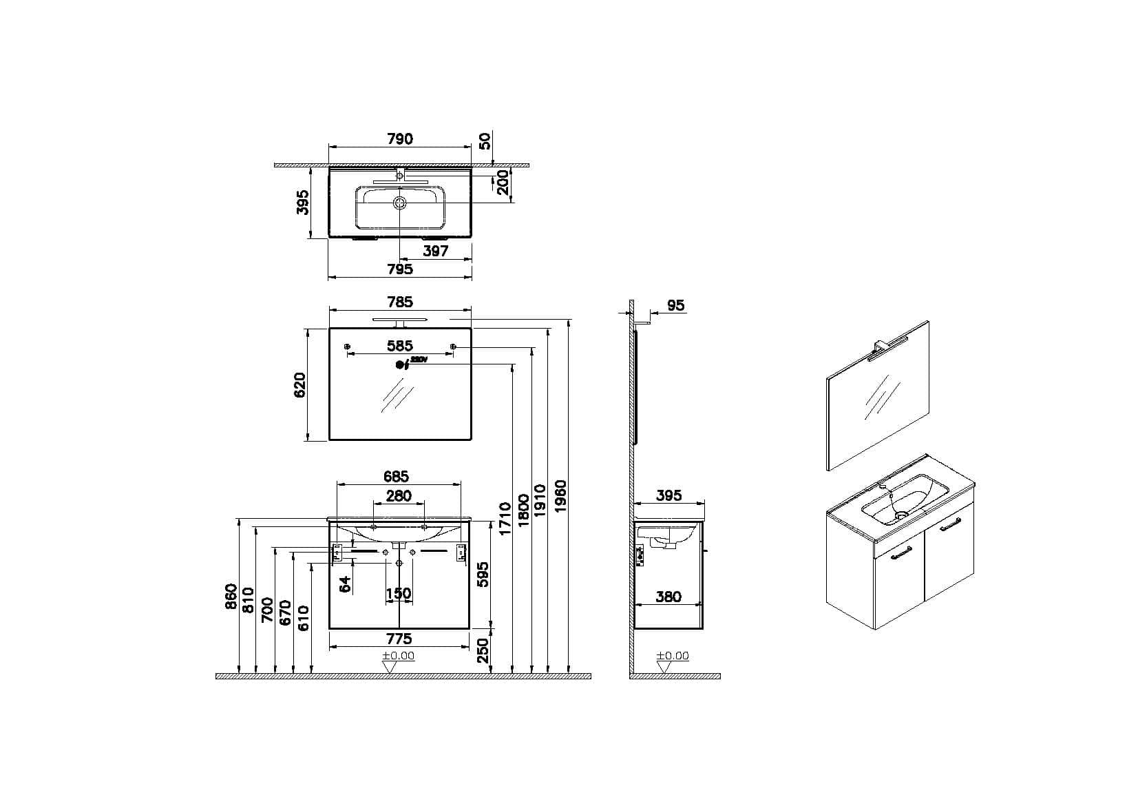 • The set consists of washbasin cabinet, 7462L003-0001 ceramic washbasin, flat mirror and LED lighting.