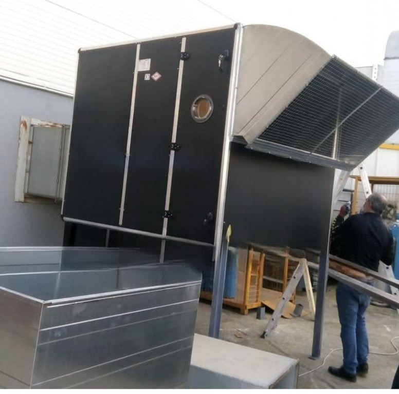 The casing is produced from galvanized sheet metal between 0.70 mm and 1 mm. It is filled with 20 mm thick glass wool as a double wall. Its frame is made of aluminum profile and the corners are plastic. The motor and fan work with belt and pulley drive on the chassis. Anti-vibration rubber mounts are provided and sealing is ensured with special gaskets. The shooting port connection is connected with a connector. The engine is connected to the chassis with a tensioning slide.
