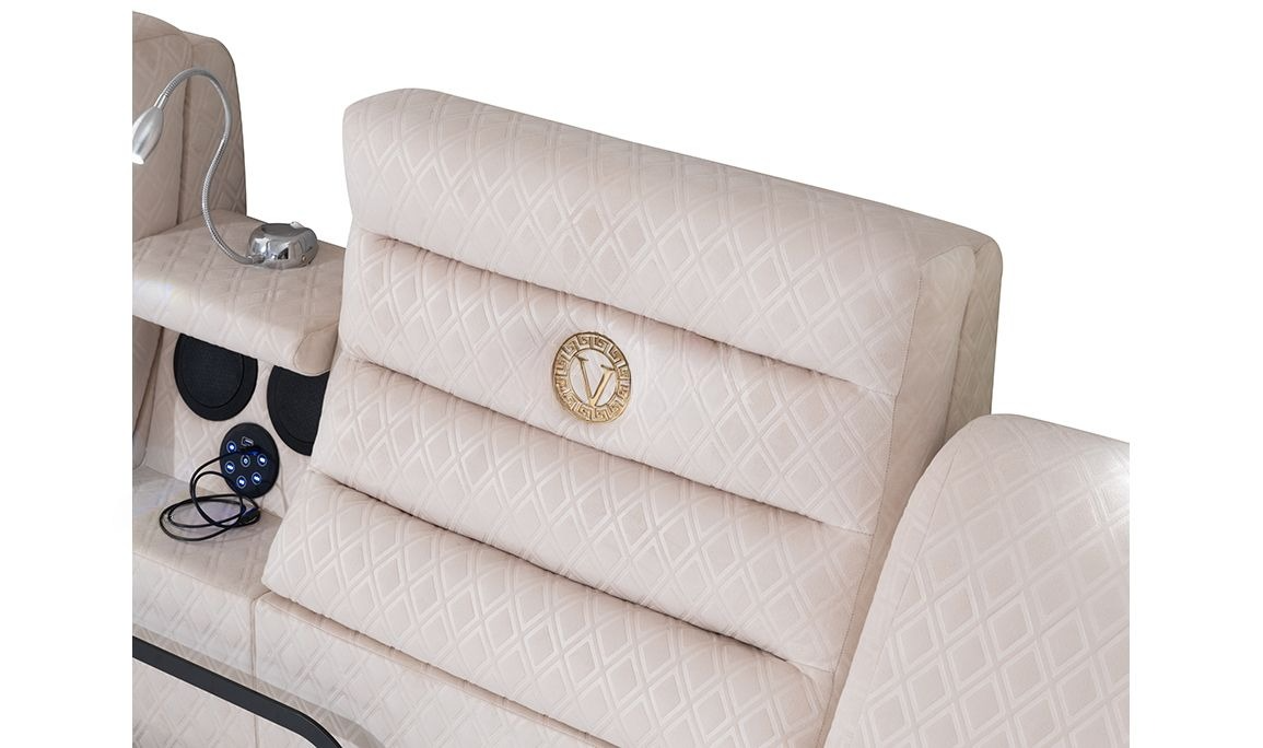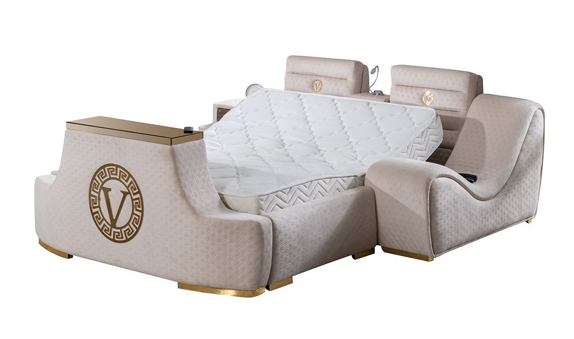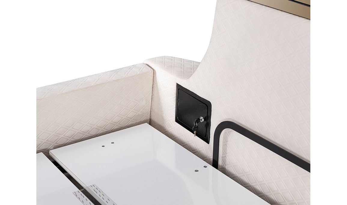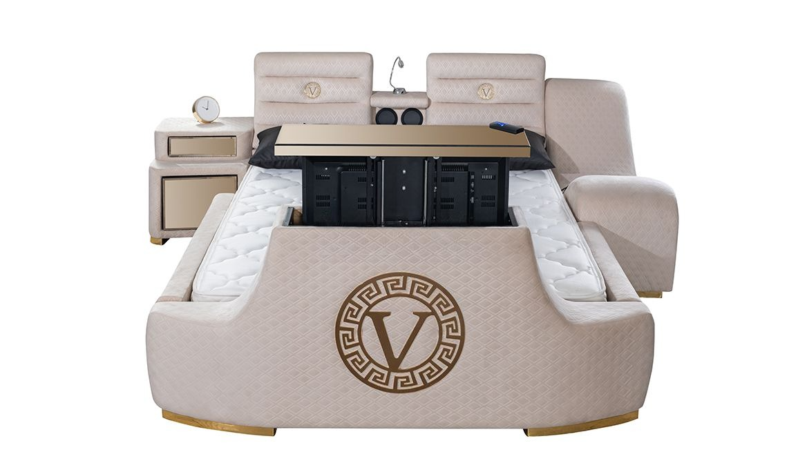 | Bed Features | Phone charging station, breakfast table, soft backrest on the headboard, electronic mechanism, Bluetooth-connected sound system, reading lamp, multi-program massage chair, hidden steel safe, TV mechanism that can be removed from the footboard with a remote control, bedside table, different size and color alternatives. |