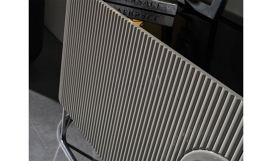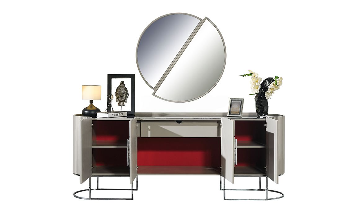 TV Unit Made of lacquered MDF material. Top plate is made of glass. Feet are made of metal. Decorated with CNC patterns.