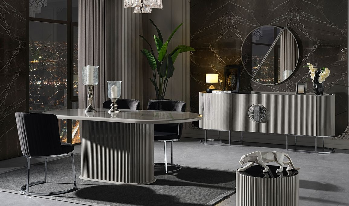 Team Content It consists of 1 console and mirror, 1 dining table, 6 chairs. TV unit and coffee tables are offered for sale as options.
