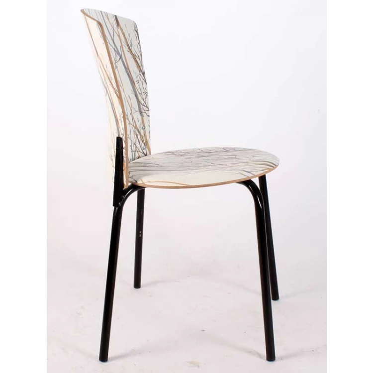 The metal chair model you are examining is produced from digitally printed laminated material printed on plywood. The seat and back parts are fixed to the metal material in a way that will not cause problems in long-term use. The black metal frame color creates an integrated concept with the product, like a separate air addition to the metal chair. The cut shape on the back of the laminated metal chair provides both an aesthetic appearance and also functions as a space that you need to hold while moving the chair.
