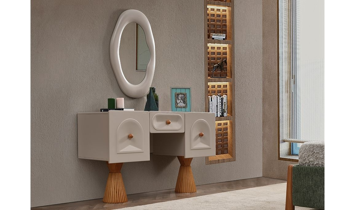 It consists of 1 wardrobe, 1 bedstead and headboard, 2 bedside tables, 1 dresser and mirror. |