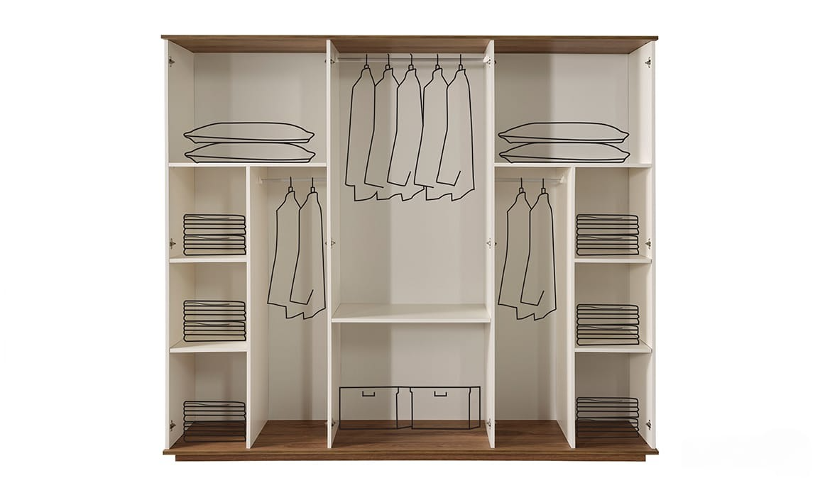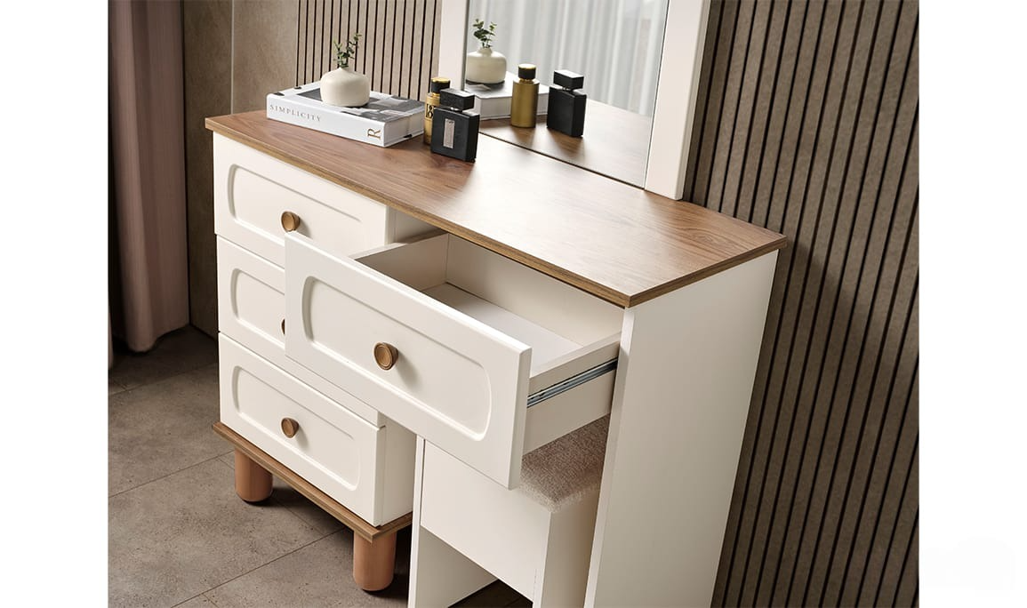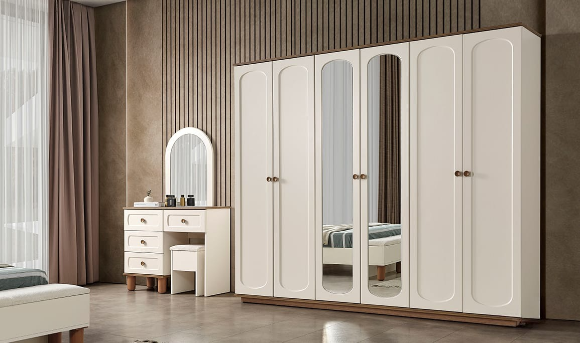 It consists of 1 wardrobe, 1 bedstead and headboard, 2 bedside tables, 1 dresser and mirror. |