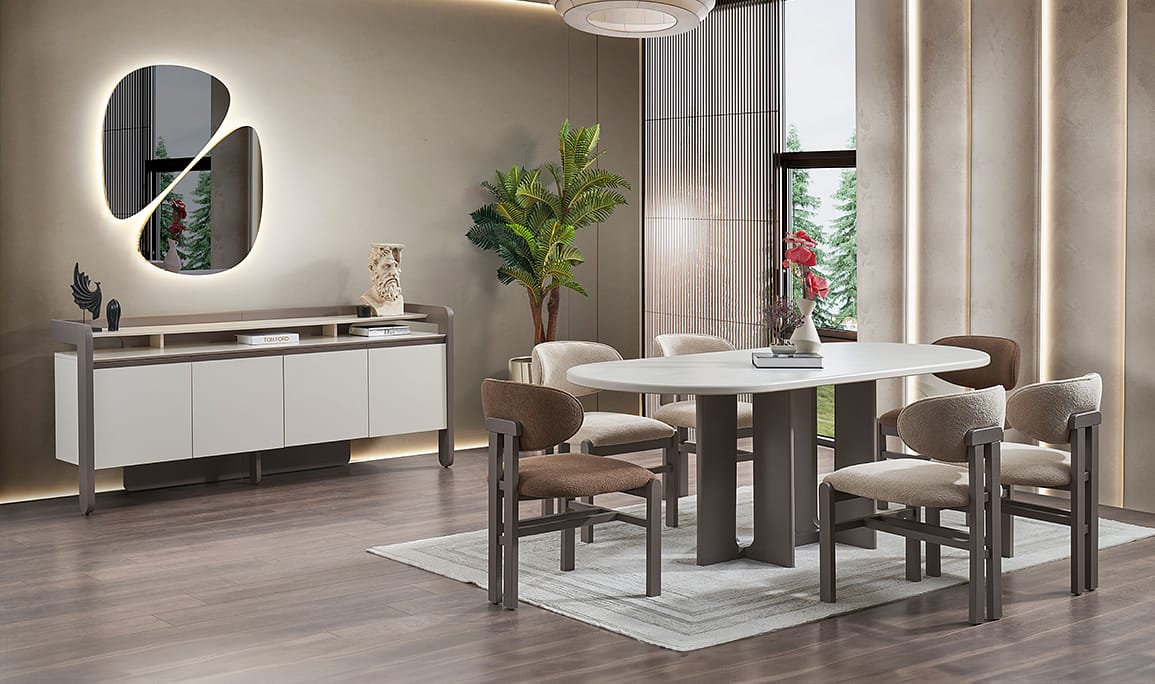 | Team Content | It consists of 1 console and mirror, 1 dining table, 6 chairs. TV unit and center table are offered for sale as options. |